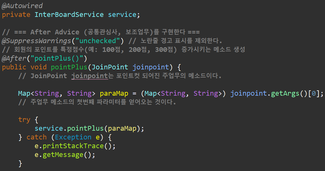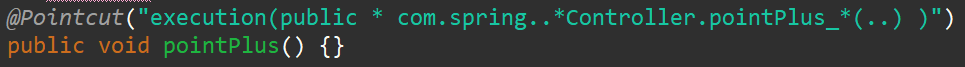 게시글을 작성할 때 마다 회원의 포인트를 증가시키는 after advice를 구현하려 한다. 마찬가지로 먼저 Pointcut 를 설정