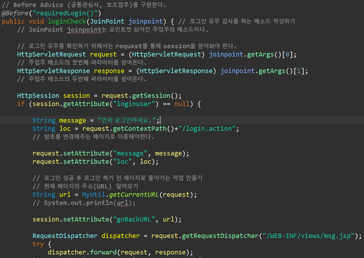 게시판을 예를들어 주업무 (게시글 작성, 글수정, 댓글작성 등등)를 실행하기 앞서서 이러한 주업무들은 공통적으로 먼저 로그인을 해야만 사용가능한 작업이므로 주업무에 대한 보조업무 (예 - 로그인 유무검사) 객체로 로그인 여부를 체크하는 관심 클래스 (Aspect 클래스)를 생성하여 포인트컷(주업무) 과 어드바이스 (보조업무)를 생성하여 동작하도록 만들겠다.