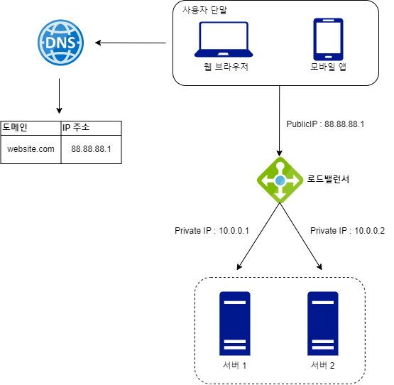사용자는 로드밸런서의 공개 IP 주소(public IP address)로 접속한다. 따라서 웹 서버는 클라이언트의 접속을 직접 처리하지 않는다.