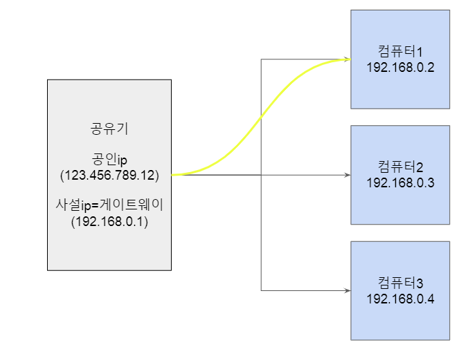 위의 예제에서 외부에서 접근할 때 공유기의 공인IP는 하나라서 포트를 붙여서오면 어느 컴퓨터로 연결해줘야 할지를 모른다. 여기서 포트포워딩을 통해 80번 포트로 들어오면 1번 컴퓨터, 22번 포트는 2번 컴퓨터 이런식으로 지정해주는 것을 말한다.