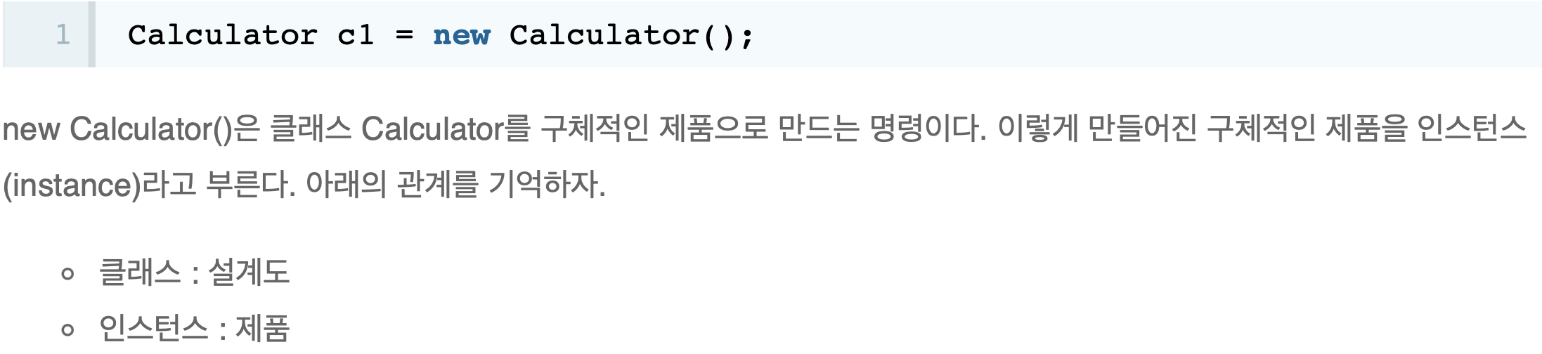 여기서 변수명 c1의 데이터 타입은 Calculator라는 의미다. 즉 클래스를 만든다는 것은 사용자 정의 데이터 타입을 만드는 것과 같은 의미다. 지금 기억할 것은 클래스를 인스턴스화 할 때는 변수에 담아야 한다는 것과 이 때 사용하는 변수의 데이터 타입은 그 클래스가 된다는 점이다.