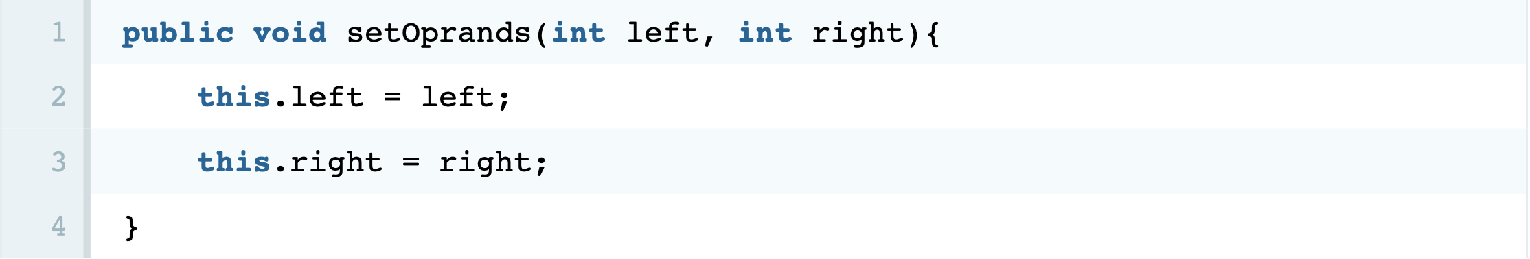 한 예제로 메소드 setOprands 내에 this.이라는 것이 있다. this는 클래스를 통해서 만들어진 인스턴스 자신을 가리킨다. 위의 코드에서 left는 매개변수이고 이 변수는 setOprands 밖에서는 접근 할 수 없다. 반면에 this.left는 4행에서 선언한 변수에 값을 설정하는 것이고 메소드 밖에서 선언한 변수는 인스턴스 내의 모든 메소드에서 접근이 가능하다.