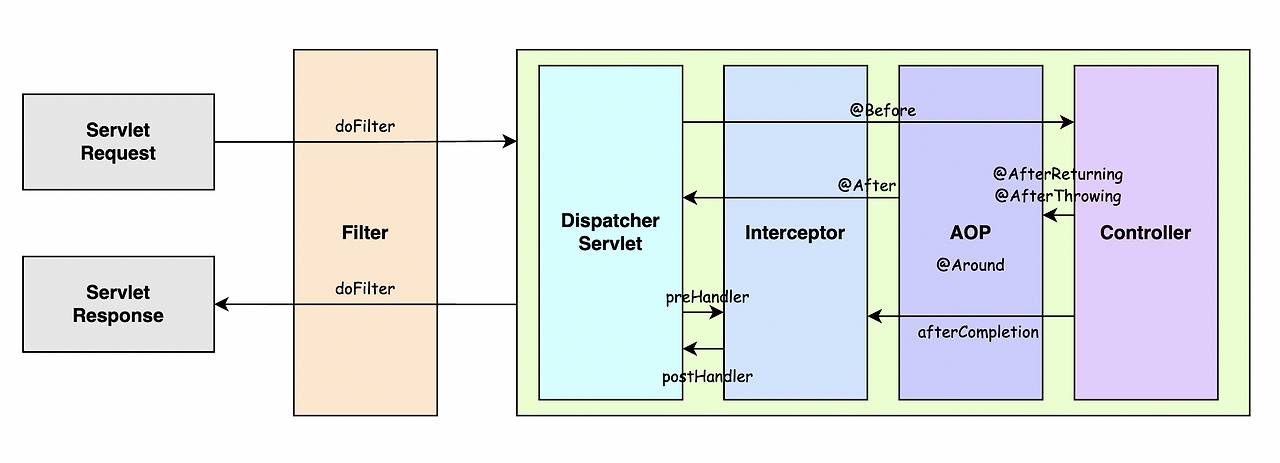 개발 환경을 세팅하던 중, 더 편리하고 용이하게 개발을 진행하기 위해 HTTP Request/Response 전체 로그를 남기는 기능을 추가하고 싶었다. 이를 어떻게 구현할 수 있을지 자료를 찾아보던 중, 대부분의 글에서 Filter 단이나 Interceptor 단에서 구현하는 방식을 소개하고 있었고, 이에 대해 보다 명확히 이해하고자 내용을 정리해본다.