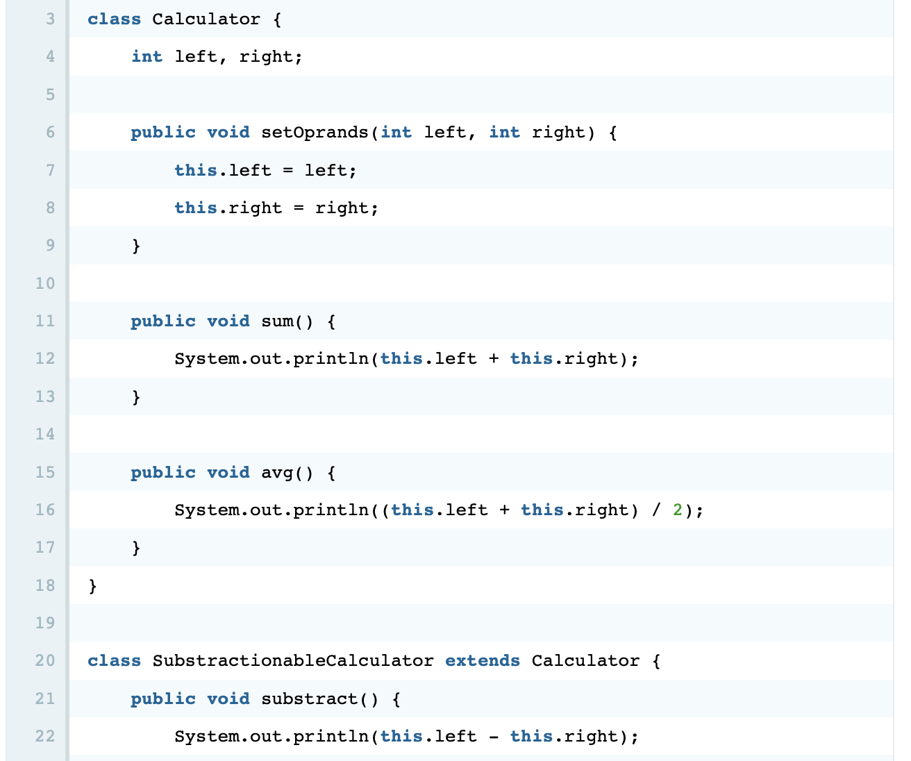 상속을 통해서 코드의 중복을 제거할 수 있었고, 또 부모 클래스을 개선하면 이를 상속받고 있는 모든 자식 클래스들에게 그 혜택이 자동으로 돌아간다. 다시 말해서 유지보수가 편리해진다는 것이다. 재활용성과 중복의 제거, 그리고 유지보수의 편의는 있지만 반대로 코드의 복잡도는 증가한다.