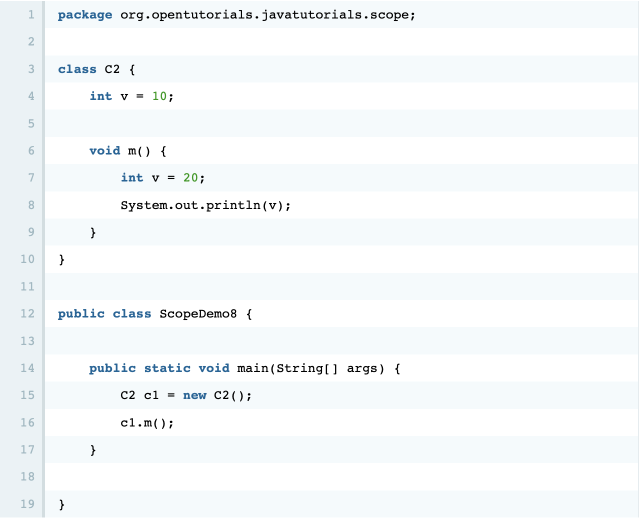 메소드 안에서 선언된 변수 v가 지역 변수가 되면서 인스턴스 전역에서 유효한 인스턴스 변수 v의 값보다 우선순위가 높아지면서 20이 출력된 것이다. (이 때 전역변수에 접근하려면 8행 변수에 this를 추가하면 된다. this는 인스턴스 자신을 의미하는 키워드이다)