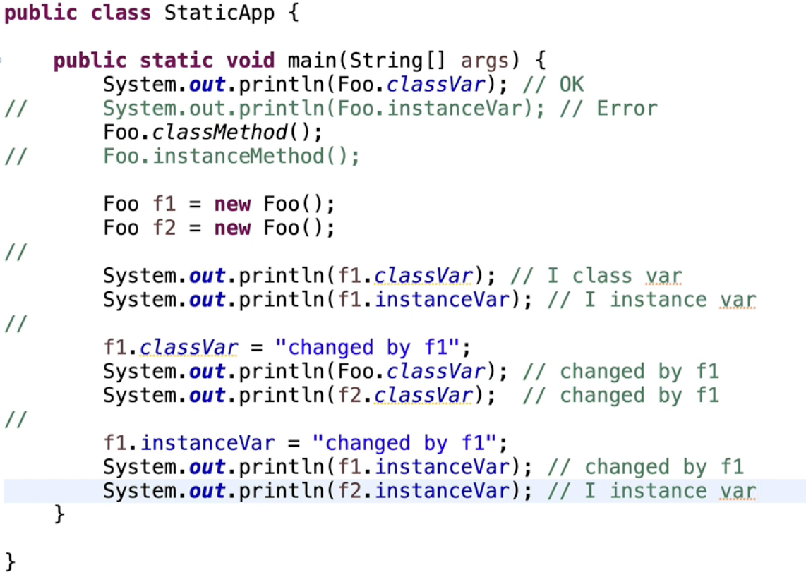 원카드로 예를들면 무늬나 숫자는 인스턴스 변수에 해당하고 클래스 변수는 카드의 폭이나 넓이 같은 카드가 가져야 할 공통적인 성질을 말한다. 이 말은 static은 공통적인 것을 정의할때 사용한다는 말이다.
