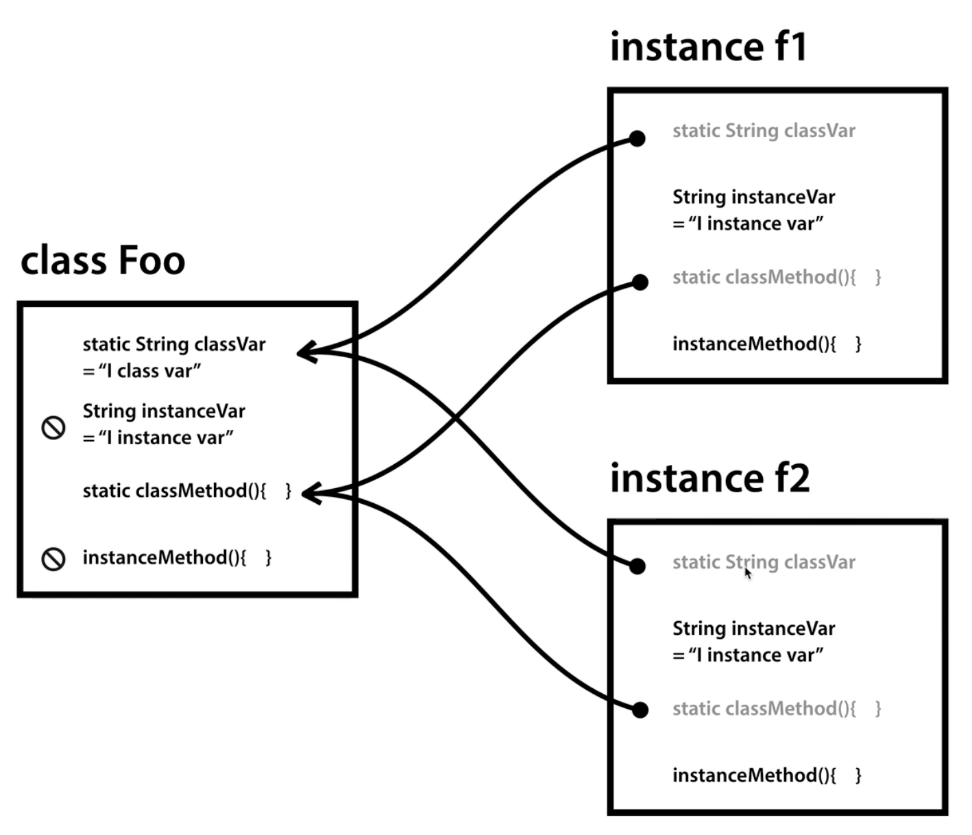 f1의 첫번째 줄은 실제로 값이 존재하지 않고 클래스 첫번째 줄을 가르킨다. 하지만 f1의 첫째줄에 값이 변경되면 가르키는 클래스의 값이 변경되고 그 해당하는 인스턴스의 값이 바뀌는 형태이다. f2의 두번째 줄은 해당 클래스의 값이 있다면 복제가 되지만 서로 링크되어있지 않은 독립적인 존재여서 f1의 값을 변경해도 클래스는 바뀌지 않는다. 메소드 또한 마찬가지이다.