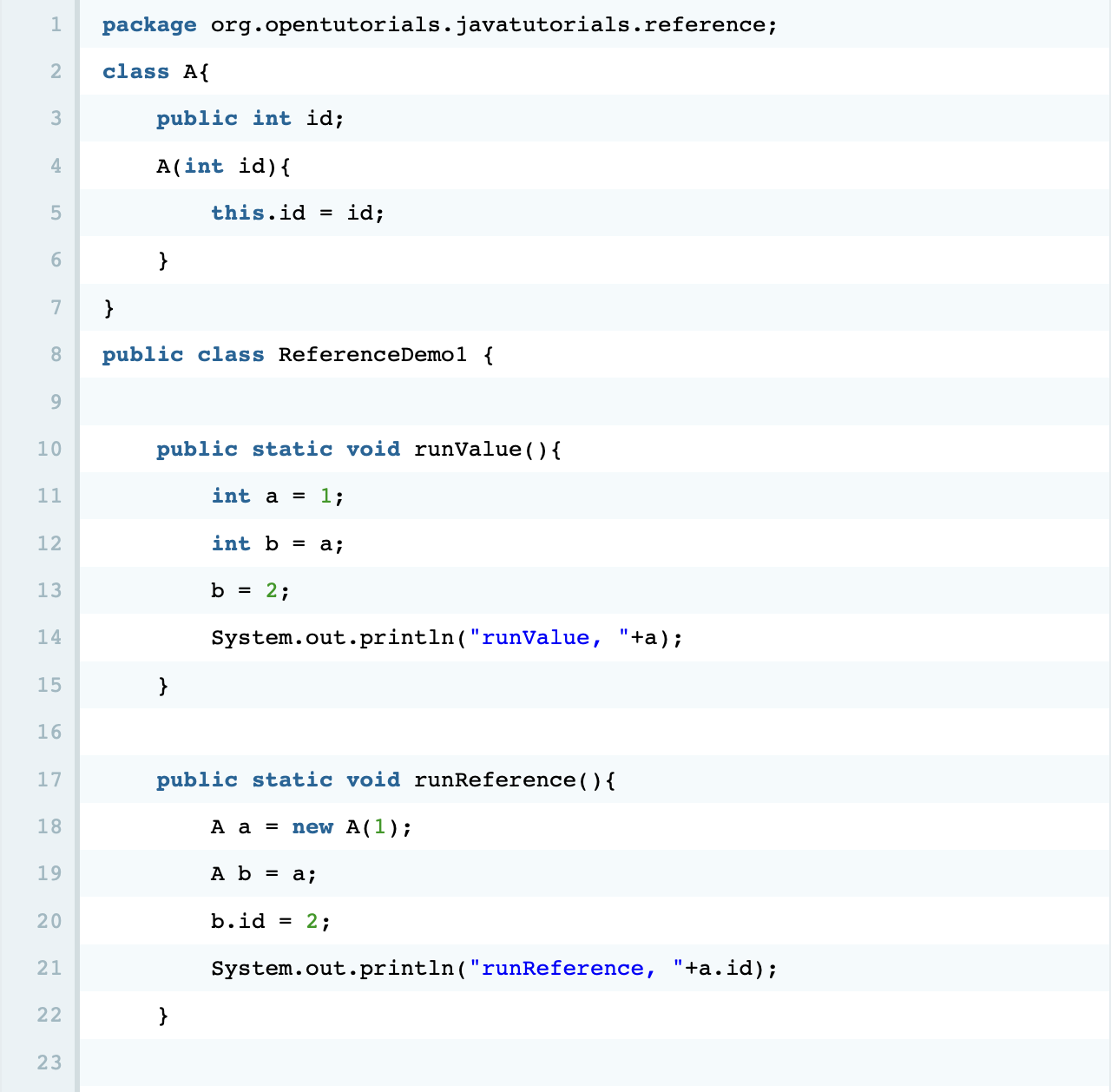 runvalue = 1, runreference = 2 가 출력된다. 둘이 같은 값인줄 알았지만 차이점이 있다. 변수 b에 담긴 인스턴스의 id 값을 2로 변경했을 뿐인데 a.id의 값도 2가 된 것이다. 이것은 변수 b와 변수 a에 담긴 인스턴스가 서로 같다는 것을 의미한다.