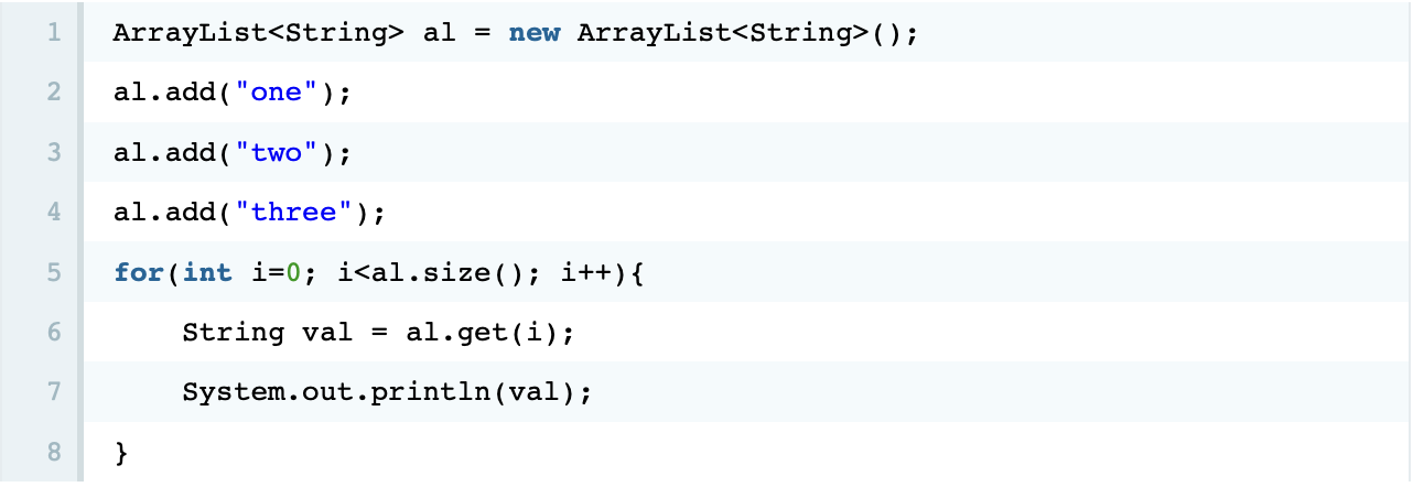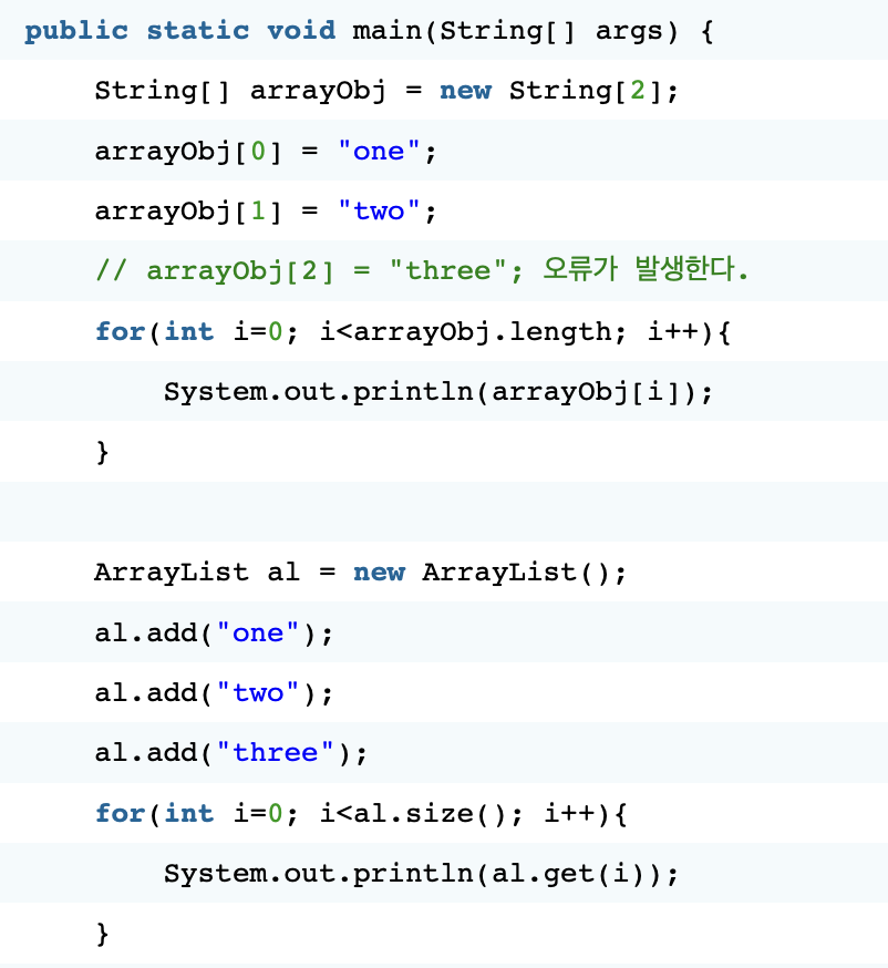 위의 예제는 배열을 사용하는 기존예제였고, 밑에 예제가 arraylist를 이용한 예제이다. 배열의 크기에 지정할 필요없이 추가하는대로 배열을 생성할 수 있다. 배열의 경우 값의 개수를 구할 때 .length를 사용했지만 ArrayList는 메소드 size를 사용한다. 또한, 특정한 값을 가져올 때 배열은 [인덱스 번호]를 사용했지만 컬렉션은 .get(인덱스 번호)를 사용한다. 배열리스트를 사용할 때 몇가지 주의할 점이 있다.