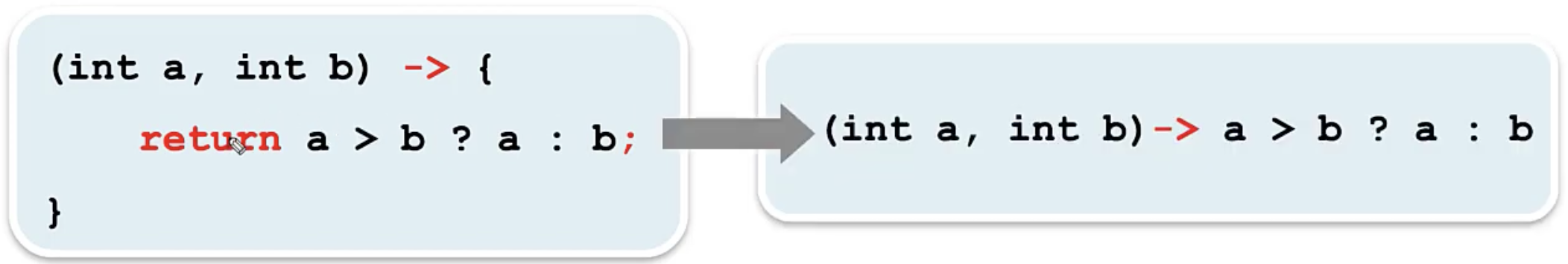 3. 매개변수의 타입이 추론 가능하면 생략가능 (위의경우 int, 대부분의 생략 가능)
