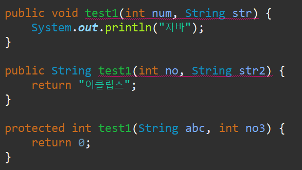 => 리턴타입은 달라도 아무런 관련이 없고 오직 메소드명과 파라미터 (매개변수)만 영향을 끼친다.