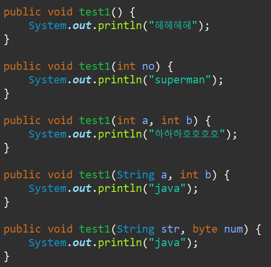 메소드의 이름이 같다고 하더라도 매개변수의 숫자와 데이터타입이 다르면 그것은 다른 메소드로 인식한다. 환경과 조건에 따라 동일 한 이름의 메소드를 여러개 정의하는것 이것을 오버로딩(overloading)이라고 한다.