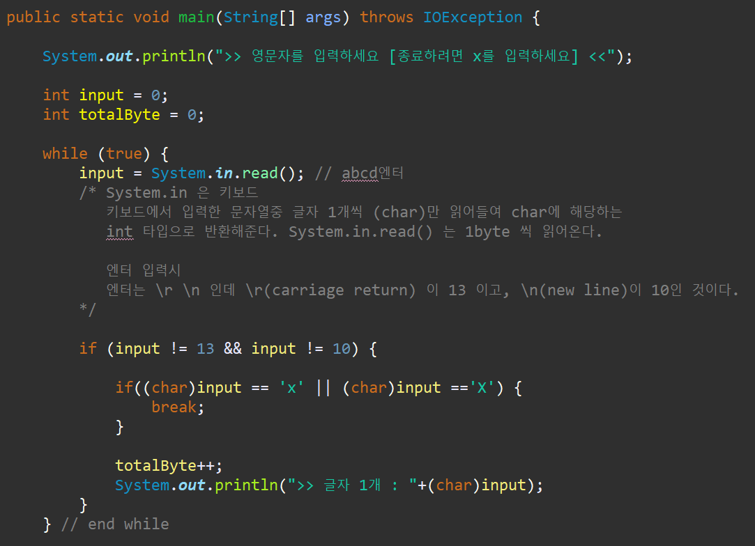 (System.in).read () - 1byte 씩 데이터를 읽어서 1byte 씩 반환하고 입력받은 값이 Ctrl+C(윈도우), Ctrl+D(유닉스,리눅스) 이라면 (강제종료를 뜻한다) -1 을 반환해주는 메소드이다. read() 메소드의 리턴타입은 byte 가 아니라 int 이다.