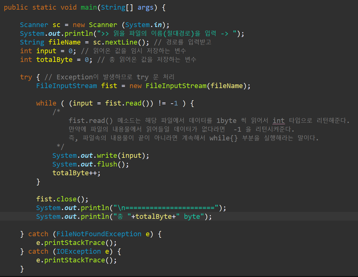 read ( ) - 메소드는 해당 파일에서 데이터를 1byte 씩 읽어서 int 타입으로 리턴해준다. 만약에 파일의 내용물에서 읽어들일 데이터가 없다라면 -1을 리턴시켜준다.