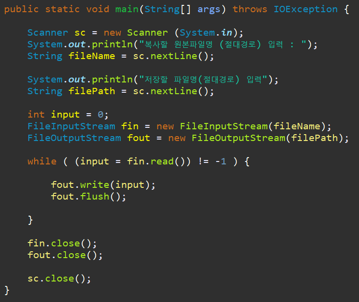복사할 파일의 경로와 저장할 파일경로를 입력받아 파일을 복사하는 예제이다. 변수 input에 읽어온 파일을 int로 저장해 그 값을 FileOutputStream을 이용해 저장하려는 경로에 출력(복사) 해주는 예이다. 또한 배열을 선언해 반복을 적게 구현할수도 있고 파일크기를 지정해 제한할 수도있다.
