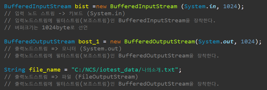 데이터목적지 : 모니터 (System.out --> 노드스트림) + 필터스트림(보조스트림)으로 BufferedOutputStream 을 사용함.