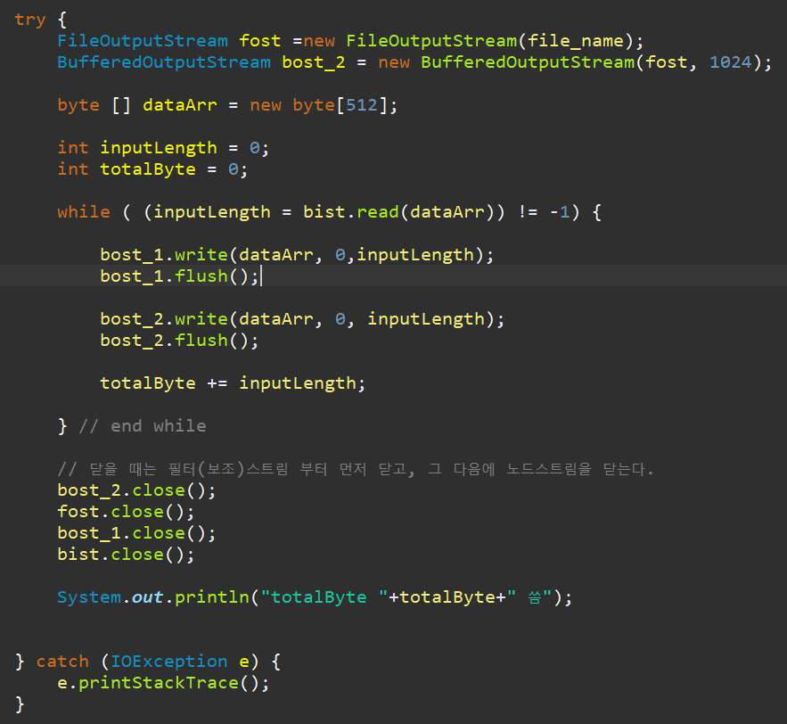 파일 (FileOutputStream --> 노드스트림) + 필터스트림(보조스트림)으로 BufferedOutputStream 을 사용함