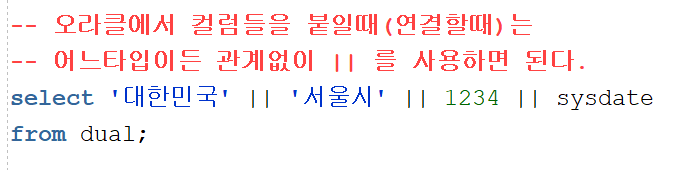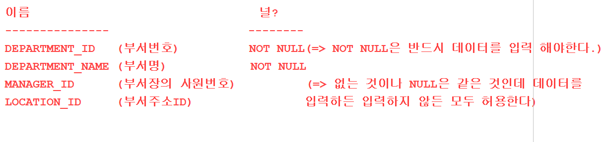 5. NULL 은 존재하지 않는 것이므로 비교대상이 될 수 없다. 비교연산자 사용불가 (비교연산을 하려면 nvl함수를 사용 해야한다, 또한 null 은 is 연산자를 이용해 나타낼 수 있다)