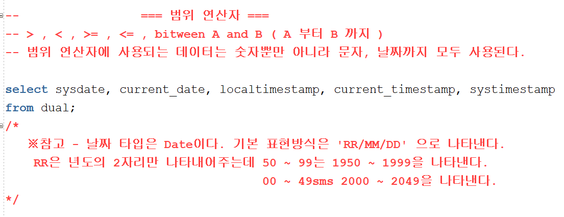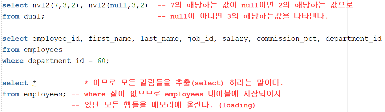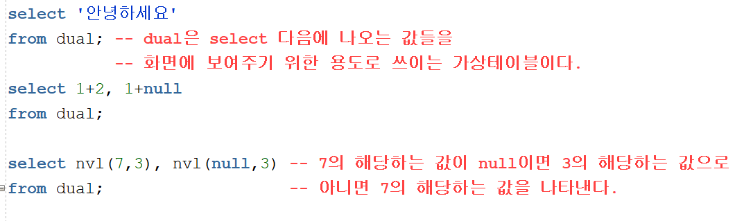5. NULL 은 존재하지 않는 것이므로 비교대상이 될 수 없다. 비교연산자 사용불가 (비교연산을 하려면 nvl함수를 사용 해야한다, 또한 null 은 is 연산자를 이용해 나타낼 수 있다)