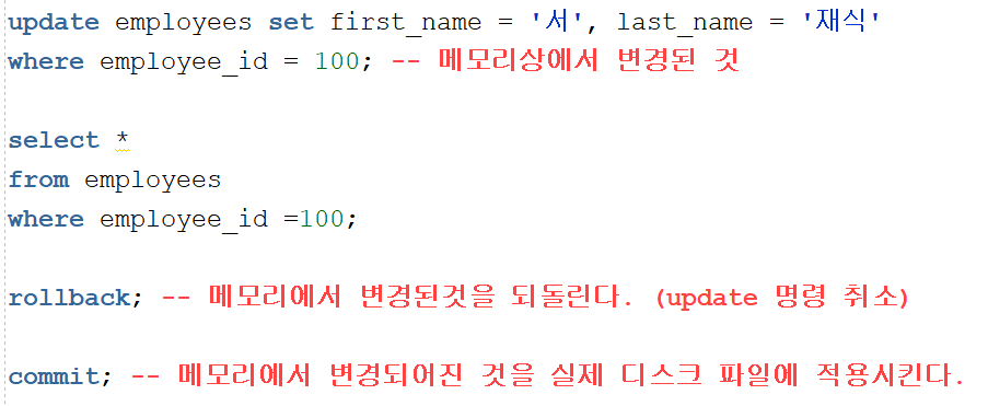 update 는 메모리상에서만 변경된 것이므로 실제 디스크에 적용하려면 commit 이 필요하다. 또한 commit 전에 메모리에 적용된 것을 되돌리는 rollback 또한 가능하다.
