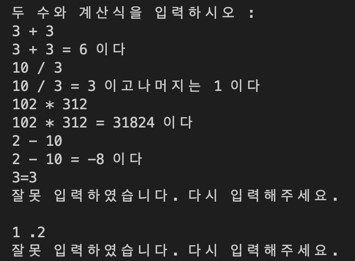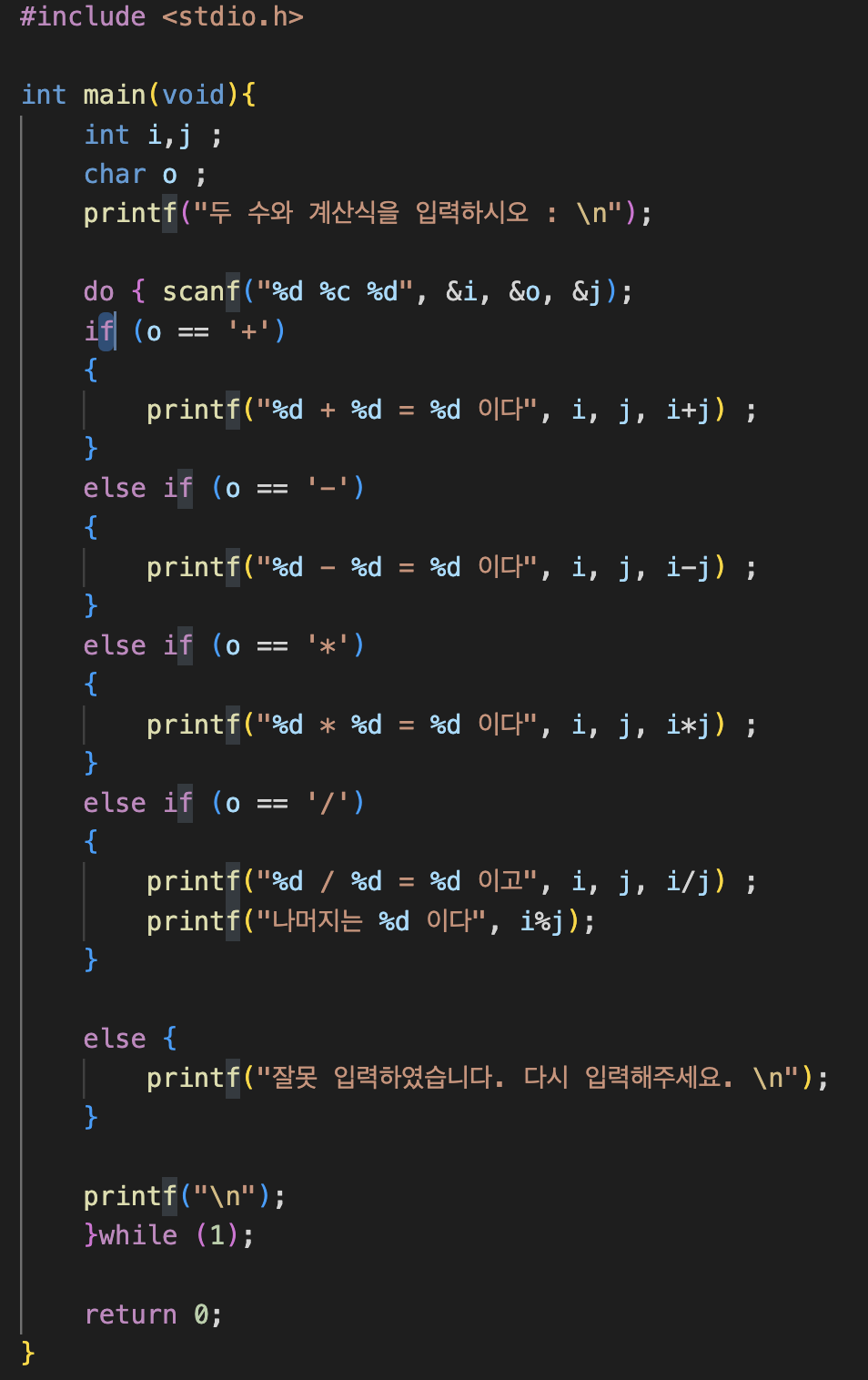강의에서 배운대로 do while문으로 단순 계산기 프로그램을 만들어봤다.