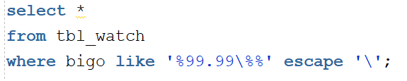 문자열에 포함된 ' % ' , ' _ ' 를 찾고자 할때에는 escape 시켜야한다. escape 문자를 선언하고 그 다음에 나오는 한글자 whild character (%, _)는 그 기능을 상실하고 순수글자 그대로 인식한다. escape 문자는 아무거나 사용할 수 있지만 보통 혼동되지 않도록 특수기호로 사용한다.