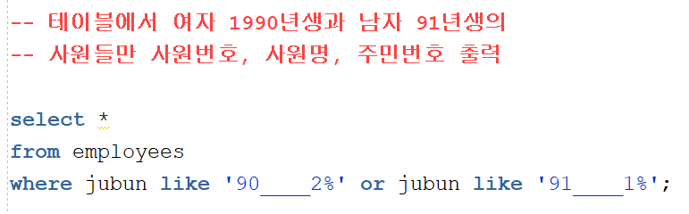 like는 ' = ' 과 같은 뜻을 지니지기도 와일드 카드와 사용해 포함된 문자열의 값을 찾는데에도 사용된다. like 연산자와 함께 사용되어지는 ' % '와 ' _ ' 를 wild chracter (wild card) 라고 부른다.