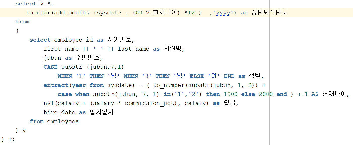 괄호로 묶은 ' V '라는 이름을 가진 inline view 를 테이블로 지정한다 라는 뜻이다. 여기서 사용할 때 주의할 점은 컬럼명은 alias 이다.