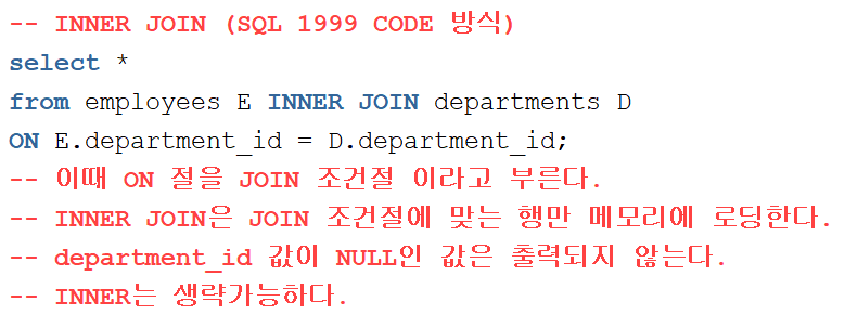 위의 예제는 서로 다른 테이블에서 department_id 값이 같은 행들끼리 연결지어 출력해준다.