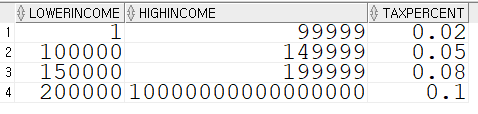 예제로 연봉의 범위에 따라 각각의 세율이 측정되어있는 테이블을 만들고 employees 테이블과 합쳐 employee 들의 각각의 세액을 매기는 테이블이다.