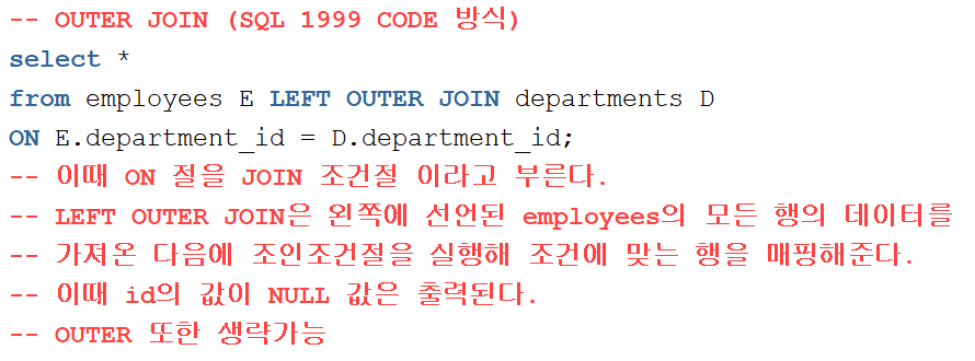 여기서 OUTER 조인은 LEFT에 RIGHT, FULL 이 들어갈 수 있으며