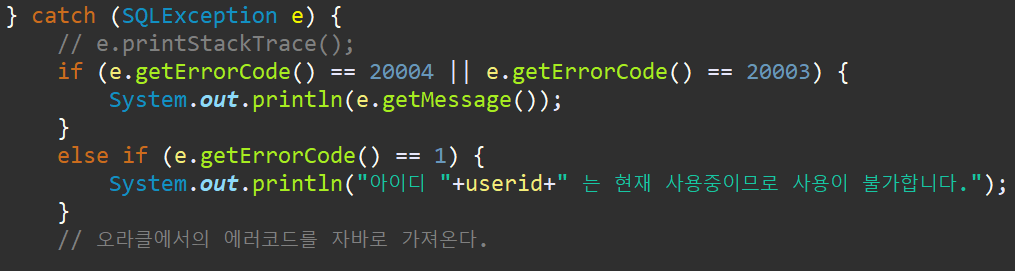 Errorcode 1은 오라클에서 Primary Key가 중복되었을때 나오는 에러코드 (제약조건의 위배) 이므로 자바에서는 그대로 가져와 출력만 다르게 (세부화) 해주었다. 나머지 20004,과 20003 도 오라클에서 이미 정의한 예외를 가져와서 처리해주었다.