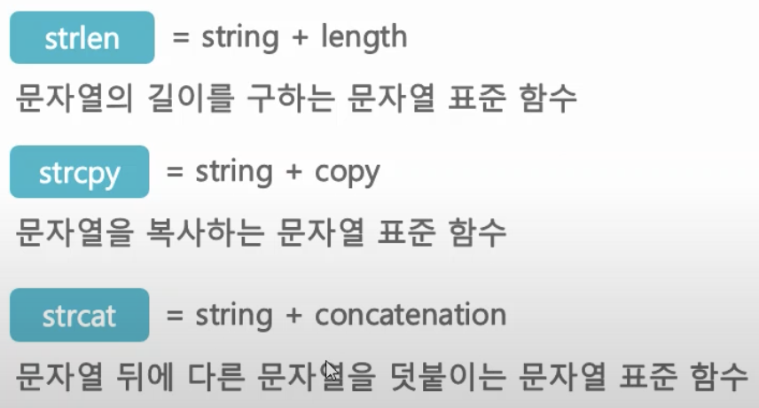 헤더 파일 <string.h> 내장 함수 - 위에 함수들은 무분별하게 많기 때문에 외우려 하지말고 어느정도 조합되는 규칙이있기 때문에 이 구조를 이해하는게 편함. 나중에 유추하기도 좋고 c언어의 경우 도움말이 잘 되어있음