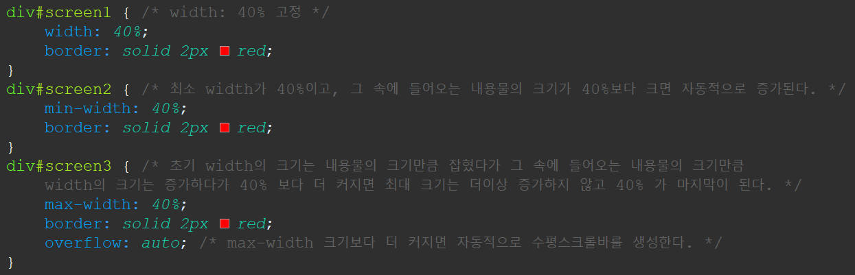 width와 height에 max와 min 속성을 부여할 수 있는데 설명은 다음 그림과 같다.