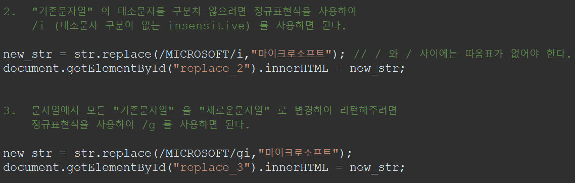 ("기존문자열" 에서 대소문자를 구분치 않으려면 정규표현식을 사용하여 /i (대소문자 구분이 없는 insensitive) 를 사용하면 된다. 또한, 문자열에서 모든 "기존문자열" 을 "새로운문자열" 로 변경하여 리턴해주려면 정규표현식을 사용하여 /g (global) 를 사용하면 된다.)