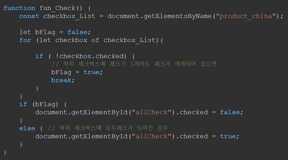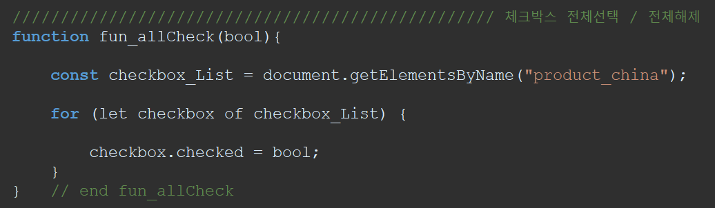 checkbox 는 배열의 개념이 필요하기 때문에 getElementById 가 아닌 getElementsByName 을 이용하여 제어한다.