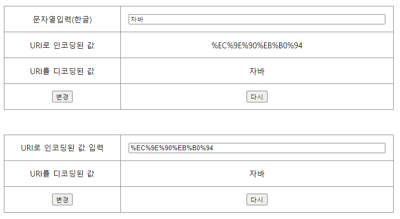 encodeURI ("문자열"); -> "문자열"을 UTF-8와 맵핑된 문자 (%문자)로 변환시켜준다.