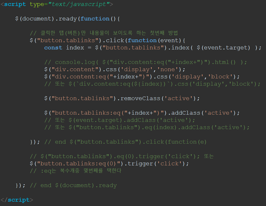 탭 메뉴를 클릭하면 버튼이 활성화 되어 해당 탭 메뉴 내용이 나타나게 한다. addClass() 메소드와 removeClass() 메소드, :eq 메소드를 사용해 구현하였다.