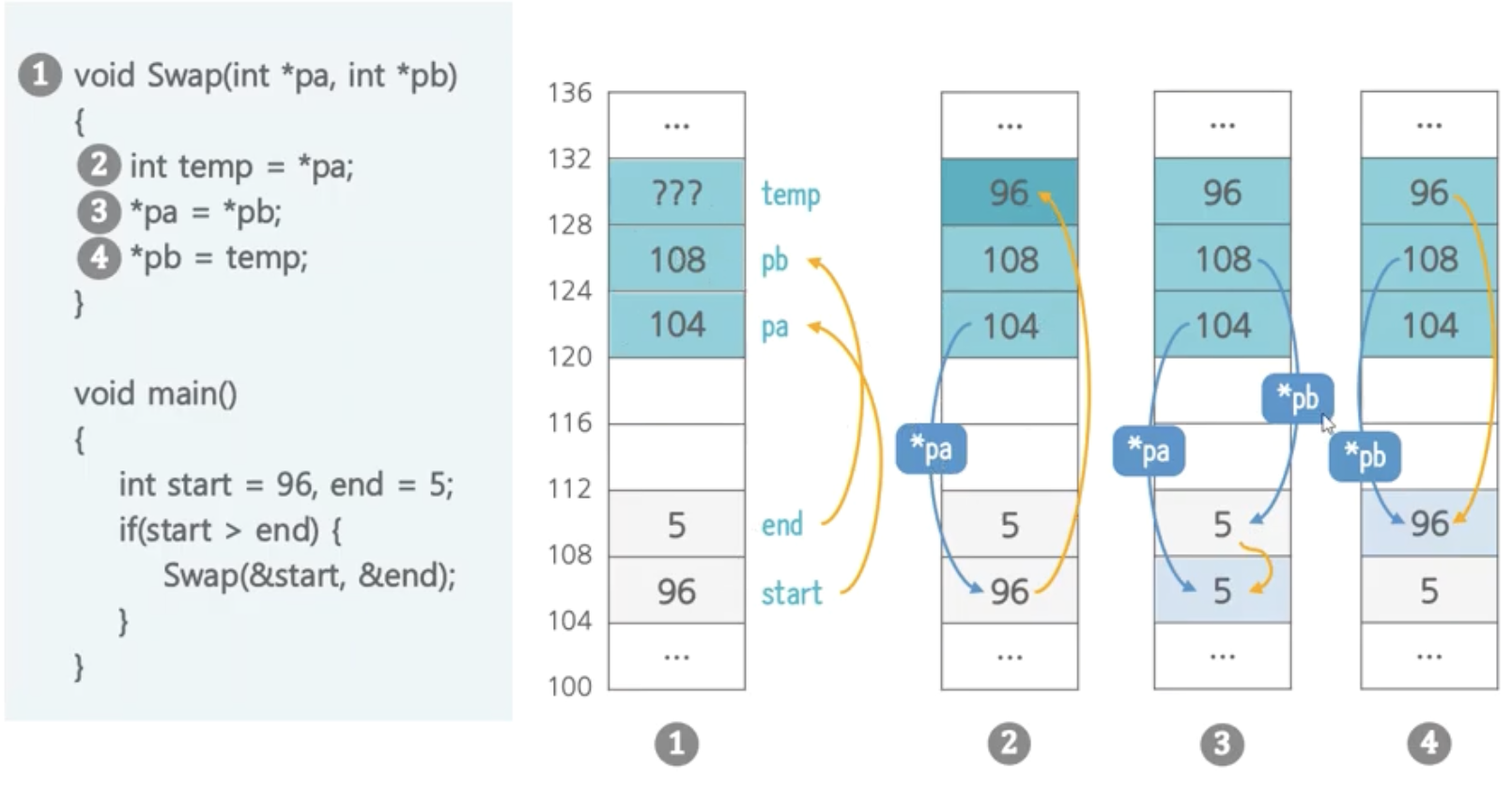 직접적인 주소 방식으로 쓰는 일반 함수로써는 스왑함수안에서만 적용이되고, 메인함수에서는 적용이 되질 않는다