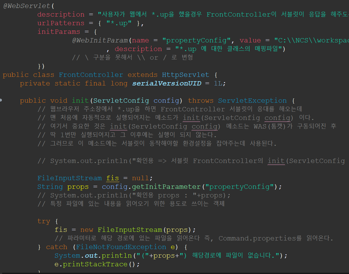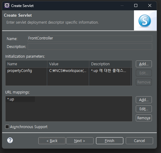 이 다음은 하나의 통합된 서블릿을 구현하는 것으로 서블릿을 만들어 name과 value (properties 경로)를 지정해 URL을 매핑하는 설정이다.