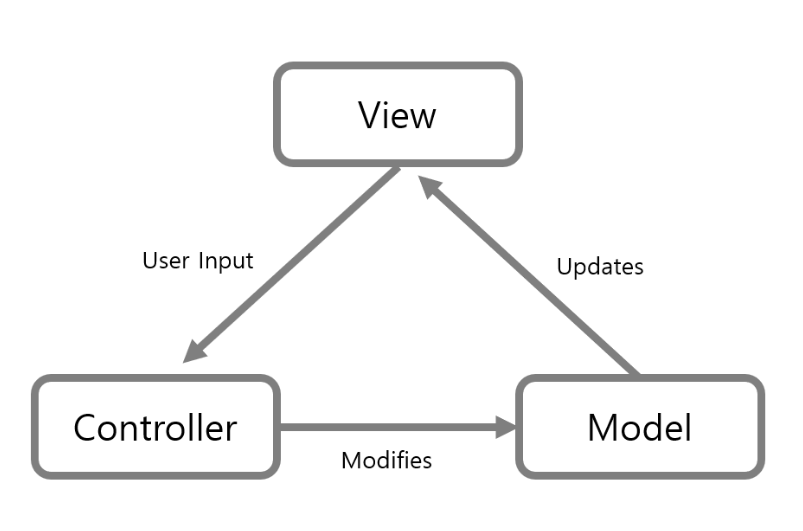 사용자 인터페이스, 데이터 및 논리 제어를 구현하는데 널리 사용되는 소프트웨어 디자인 패턴으로 소프트웨어의 비즈니스 로직과 화면을 구분하는데 중점을 두고 있다. controller를 조작하면 controller는 model을 통해서 데이터를 가져오고 그 정보를 바탕으로 시각적인 표현을 담당하는 View를 제어해서 사용자에게 전달하게 된다.
