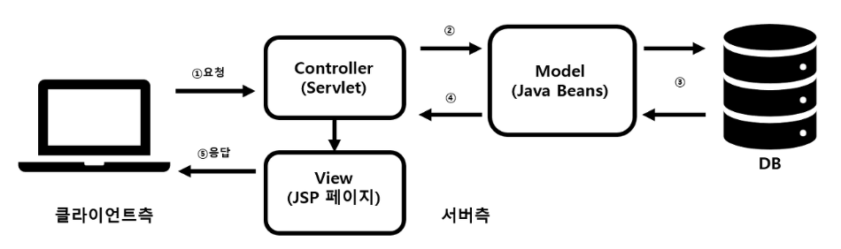 Model 2 방식은 웹브라우저 사용자의 요청을 서블릿이 받고 서블릿은 해당 요청으로 View로 보여줄 것인지 Model로 보낼 것인지를 판단하여 전송한다.이 경우 HTML 소스와 Java 소스를 분리해놓았기 때문에 모델 1 방식에 비해 확장과 유지보수에 유리하다.