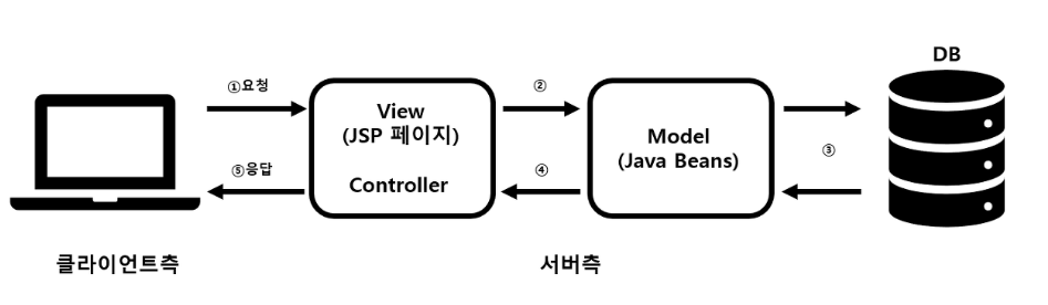Model 1 방식은 Controller 영역에 View 영역을 같이 구현하는 방식이며, 사용자의 요청을 JSP가 전부 처리한다. 요청을 받은 JSP는 JavaBean Service Class를 사용하여 웹브라우저 사용자가 요청한 작업을 처리하고 그 결과를 출력한다.