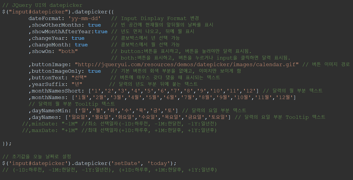 | dateFormat | 'yy-mm-dd' 와 같은 Date 형식 | Input Display Format 변경 |